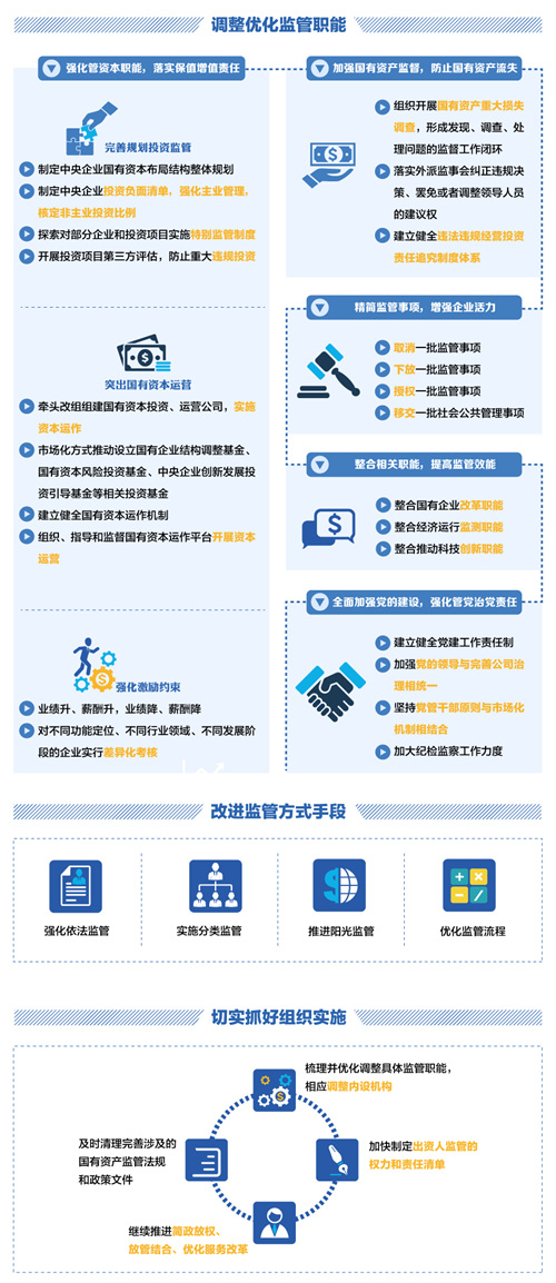 党的十八大以来,国务院国资委认真贯彻落实党中央、国务院关于深化国有企业改革的决策部署,准确把握国有资产监管机构的出资人代表职责定位,坚定不移深化国有企业改革,探索完善国有资产监管体制机制,积极推进国有企业结构调整、创新发展,为实现国有资产保值增值、防止国有资产流失、发展壮大国有经济作出了积极贡献。但与此同时,国有资产监督机制尚不健全,国有资产监管中越位、缺位、错位问题依然存在,亟需加快调整优化监管职能和方式,推进国有资产监管机构职能转变,进一步提高国有资本运营和配置效率。4月27日,国务院办公厅转发《国务院国资委以管资本为主推进职能转变方案》,明确提出调整优化国资监管职能,改进监管方式手段,着力提高国有资本效率,增强国有企业活力。文件还明确了精简的国资监管事项共43项。