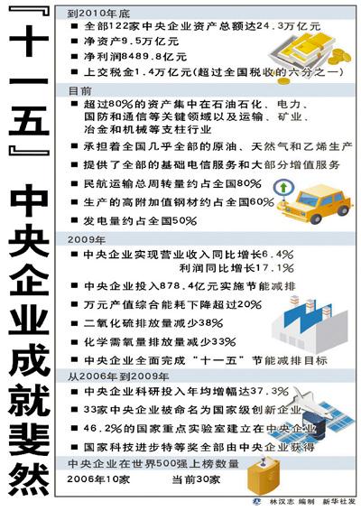 企业是经济的微观基础。2010年公布的世界500强企业中,中央企业有30家上榜。其中中国石化、国家电网和中国石油均位列前10名。中国石油更是一度排名全球市值第一。“十一五”的5年,中央企业资产总额、营业收入、上缴税金和税后净利润等主要经营指标均实现了翻番,年均国有资产保值增值率达到115%。中央企业分享着中国经济平稳快速发展的成果,更为国民经济和社会发展贡献着力量。