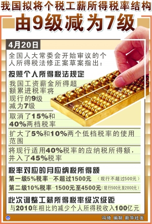 据介绍,由于草案拟将现行的9级超额累进税率修改为7级,为平衡个体工商户生产经营所得纳税人和承包承租经营所得纳税人与工薪所得纳税人的税负水平,草案维持现行对生产经营所得的5级税率级次不变,对生产经营所得税率表的级距作了相应调整,将税率表的第一级级距由年应纳税所得额5000元调整为15000元,其他各档的级距也相应作了调整。