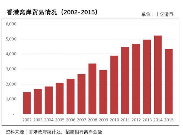 拿香港来说,2015年,香港的离岸贸易规模已经达到了4.33万亿港币,占其年度贸易总量的55%。