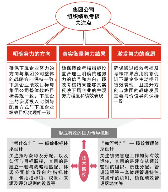 绩效管理是集团业绩管理的职能支撑,没有战略的绩效管理最终会流于形式。无论是地方国有投资集团考核主体转变,还是集团发生战略转型,势必要对下属企业的绩效管理体系进行系统化的改革。具体而言,对下属企业的考核管理可从明确努力方向、真实衡量努力结果、激发努力意愿三个方面入手,通过职能部门的配合协作,进行指标体系重塑及考核体系优化,最终形成有效的压力传导。